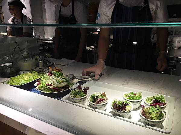 湯有番茄蔬菜湯跟玉米巧達湯,沙拉的話這邊店員裝好就會拿個托盤給你